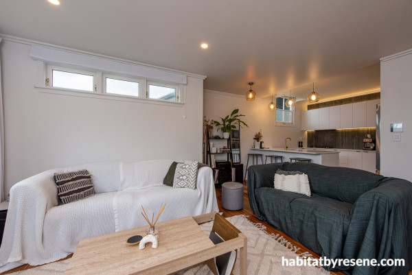 Russell, a project manager at Parliamentary Service, and Anna, a general manager at KiwiRail, managed to split the two levels as planned. They changed four bedrooms and a staircase into three bedrooms with a living room, bathroom and kitchen on the upper main dwelling. They got the space to a liveable state in the nick of time, with plumbing finished in the bathroom and kitchen the day before their child arrived.