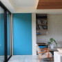 The door that divides the teenagers' wing from the main living space is painted with Resene Ming which contrasts with the Resene Double Spanish White walls and ceiling in Resene Half Spanish White. The timber ceiling panel is designed to soften the echo from the large open plan living, dining and kitchen. Add a rich timber colour to ceilings with Resene Colorwood Matai and Resene Aquaclear.