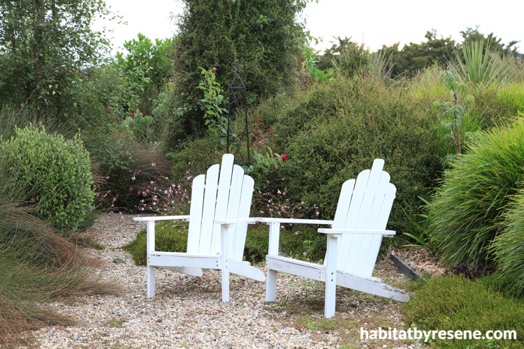 Creating usable entertaining spaces is key to making the most of your outdoor living. The Cape Cod chairs in Resene Double Spanish White are a perfect place for a morning coffee (or evening wine).