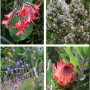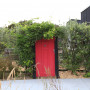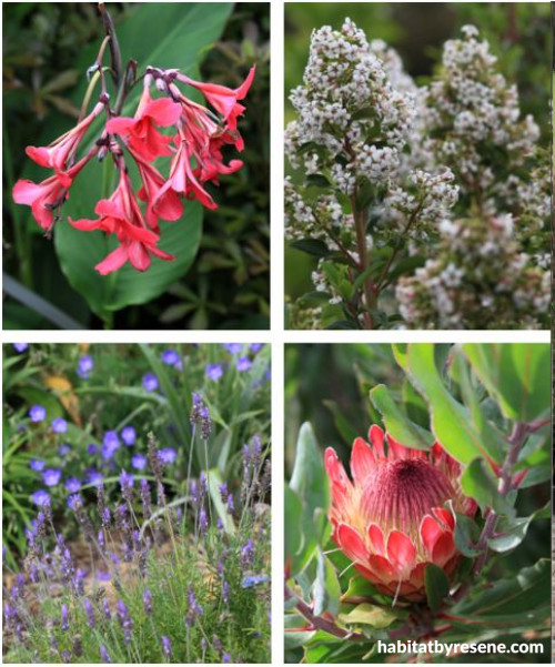 Plants clockwise from left – the scarlet red flowers of Canna iridiflora, breaks up the green and is a great option for breezy properties. Though it has delicate looking white flowers, Escallonia is another hardy plant which tolerates harsh weather conditions. Proteas are very tolerant of salty coastal soil, this variety ‘Pink Ice’ picks up the red accents in the garden including the Resene Geronimo gate door. There are touches of purple around the garden including Lavender and Geranium ‘Rozanne’ (in the background).