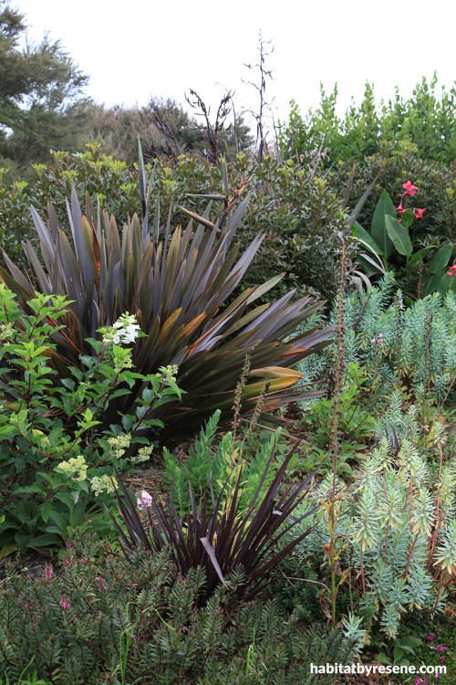 Claire’s foresight and design allow her to spend time with her family, rather than elbow-deep in dirt. “Everything is generally low maintenance. I wait until a plant looks tired, then get in there and tidy.” The flax is Phormium tenax Purpureum.