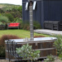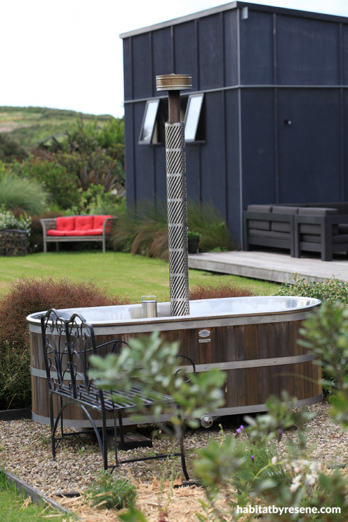 The outdoor bath is from Wanaka company Stoked Stainless. “It’s designed to be wood-fired, but waiting hours for the water to warm takes away the romance. I’ve had a hot water tap installed outside and run a hose to the bath - I should have got it plumbed.” It blends in with the brown, red and greens in the garden and the house exterior which is stained with Resene Woodsman Pitch Black.