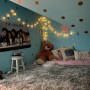 Another view of 12 year old Yve’s room where the walls are painted in Resene Spray. Fairy lights and spot colour circles add a fun element to the room which features Resene Quarter Alabaster on the ceiling and trims.