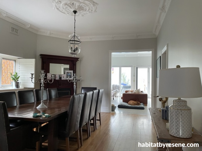 The dining room leads into the lounge extension, where old meets new. Resene Triple Merino ties both rooms together and even in the rooms with less natural light Nikki says this colour is a calming grey that she loves in all lights. Steve and Nikki own a concreting business and the new floors were laid by their company Manpower Concreting while they retained the original rimu floorboards in the old parts of the house. The ceiling and all trims are in Resene Quarter Alabaster.