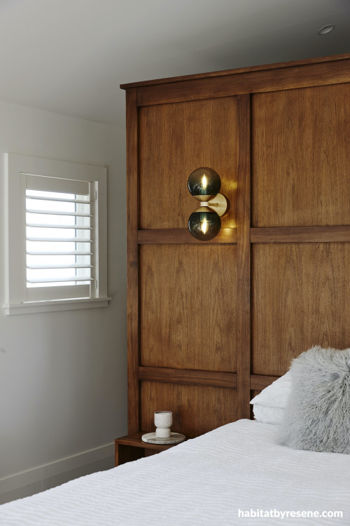 The master bedroom displays a unique and stunning walnut feature wall behind the bed, with matching battens and a French polished finish for extra shine and glam. This stands out delightfully next to the light neutral walls and raked ceiling in Resene Quarter Rice Cake.