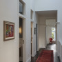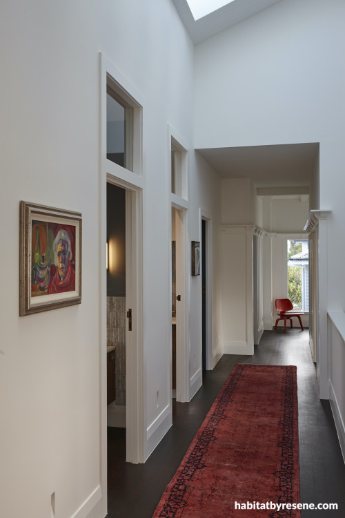 This gallery-like hallway, painted in Resene Quarter Rice Cake, draws you down to the rooms which are each painted in a different Resene colour. The artwork and red rug line the hallway and are a great contrast against the white walls.