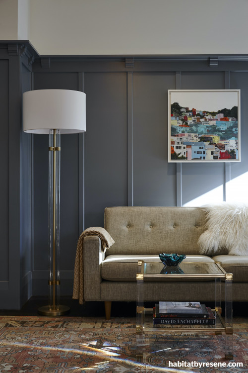 The neutral shades of this living room allow artwork and other décor like this detailed rug to pop through as main features. The lower panelled walls are painted in Resene Raven, with upper walls and trims painted in Resene Quarter Rice Cake.