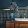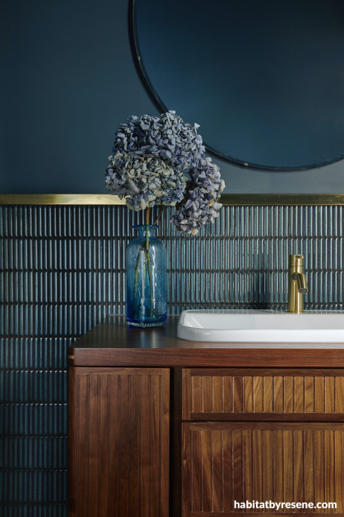 Arguably one of the most stunning rooms in the home, the powder room, was given a dark and elegant feel. The deep slate blue with moody undertones of green, Resene Fast Forward, was painted on the walls, pairing perfectly with the glossy peacock coloured finger tiles and brushed brass tapware and shelf.