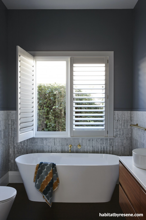 This children’s bathroom is a timeless space, with walls painted in Resene Raven and trims and ceiling in Resene Quarter Rice Cake. The shimmering grey tiles, wooden features and brass finishes are an elegant touch.