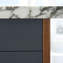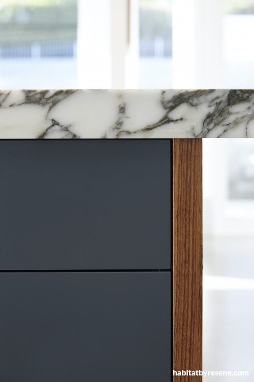Mel and Joe had chosen a statement marble and walnut finish for the kitchen, so to bring some colour to the cabinetry, Resene Tuna was chosen for its deep distinguished grey with undertones of blue, working particularly well with the marble veining. This bold shade pairs well with Resene Raven, used in the living room to create cosiness and interest in the space. These two blue-grey shades, along with neutral walls and ceiling, create a cohesive feel throughout the home while still working to separate areas.