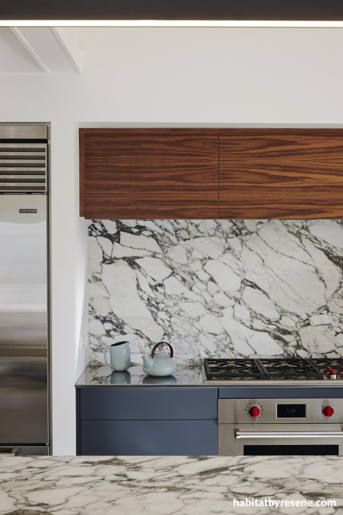 The dark veining in the marble pairs well with the bold and moody shade of Resene Tuna on the cabinetry. The walls and ceiling are painted in Resene Quarter Rice Cake.
