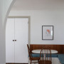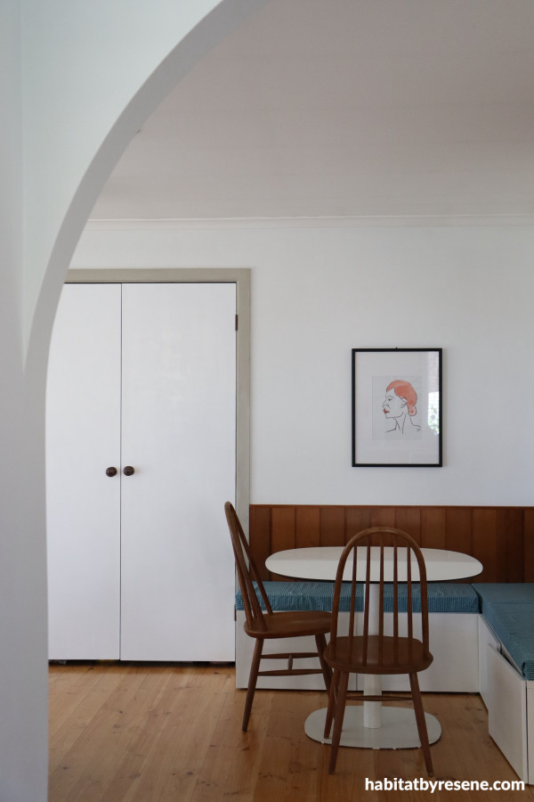 The dining room is both practical and functional, featuring a cleverly designed bench seat in the corner that maximises space. The walls and ceiling are painted in Resene Sea Fog.