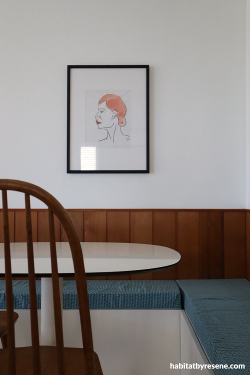 Becka, a true DIY enthusiast, made her own bench cushions, choosing a teal fabric that pairs beautifully with the darker timber panelling and Resene Sea Fog walls.