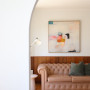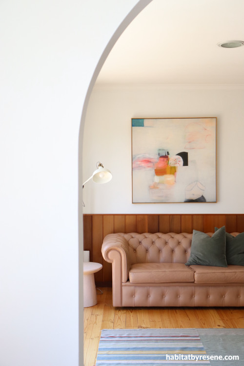 The wall arches and timber panelling add character to this 1970s home, while the contemporary art and décor, and freshly painted walls and ceiling in Resene Sea Fog bring a modern, chic touch.
