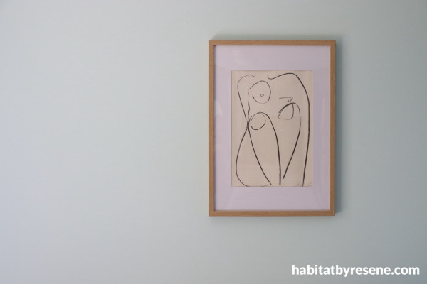 The main bedroom offers another unique touch with a pale blue that Becka describes as “a kind of sky colour.” “I love it because it’s soothing and unusual,” she says. Resene Onahau is a breezy pastel blue and fit into Becka’s vision of a restful bedroom space.