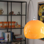 One standout piece is a pink leather Chesterfield sofa, paired with an orange Perspex lamp and a brightly tiled table, all offset beautifully by the muted tones of the walls.