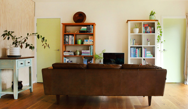 Living room walls in Resene Half Rice Cake and Colorwood Rock Salt finished in Resene Aquaclear, doors in Soft Apple.