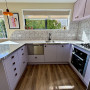 The kitchen cabinets embrace contrast with Resene Alluring painted on the top cabinets and Resene Abbey Road on the bottom cabinets. Two kitchen window arches in Resene Half Rice Cake added a subtle yet striking detail. The walls are painted in Resene Quarter Pavlova.