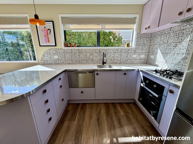 One of the standout successes of the project was the kitchen transformation. By removing a cupboard, rounding off the breakfast bar and giving the cabinets fresh coats of paint, they achieved the look of a high-end $40,000 kitchen for under $2,000.