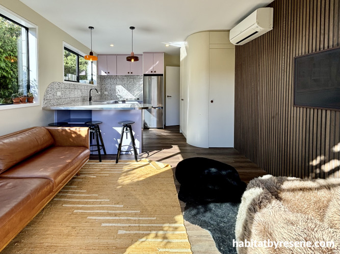 One of the biggest challenges was optimising the layout. With a small space to work with, every inch mattered. They made the second bedroom slightly smaller to free up space in the living area and incorporated curved feature walls and cabinetry for a softer, more open feel. “The tweaks we made have given us so much more usable space,” says Christy.