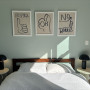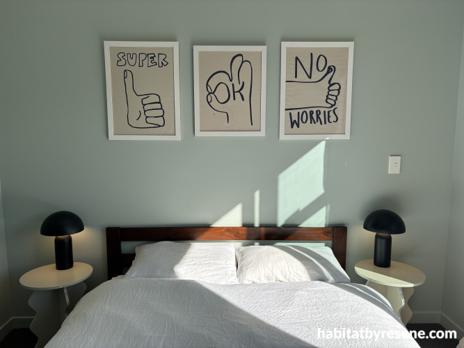 Resene Half Robin Egg Blue, adorning the bedroom walls, is a smoky soft green blue creating a calm, restful retreat.