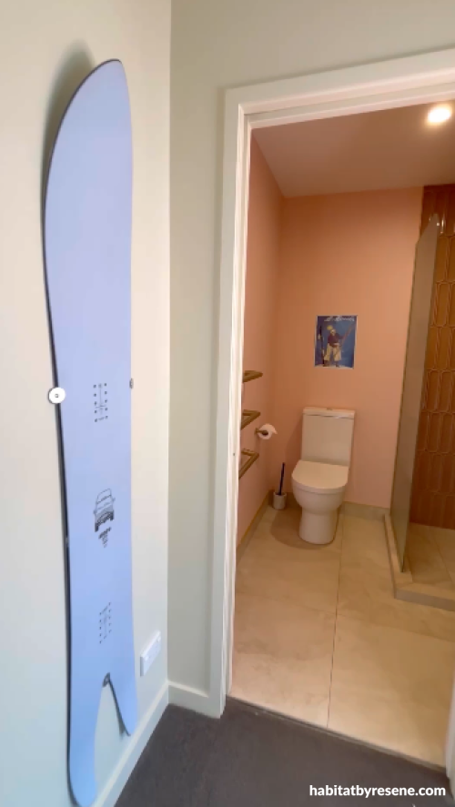 In the hallway, Resene Quarter Pavlova offers a neutral backdrop for personal belongings and artwork. The bathroom is warm and inviting painted in Resene Sakura.