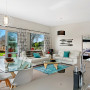 The furniture in the open plan living spaces co-ordinates with the Resene Tapa walls and Resene Alabaster ceiling. The interior colours accentuate the view of the lush landscaped garden.