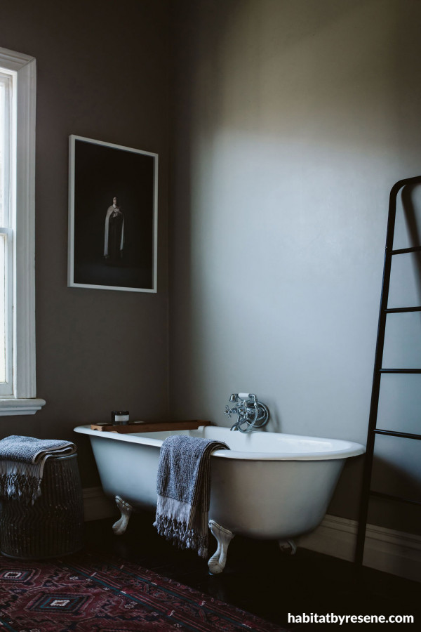 Resene Gauntlet makes a bold statement in the bathroom behind a clawfoot tub, set off with Resene Alabaster on the ceiling, skirting and architraves. Resene Alabaster was used again in the office across the whole room to keep things fresh and shines a light on original brickwork in the space. The brick is used as an inspiration zone, hung with brown paper to create lists and notes.