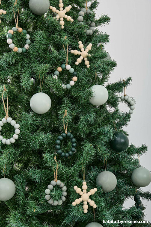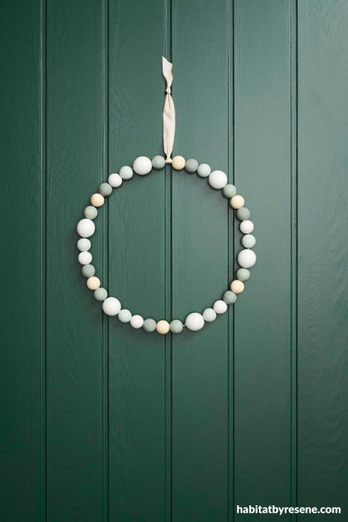 Make decorating extra fun this year with DIY beaded decorations. These are painted in Resene Palm Green, Resene Rainee, Resene Xanadu, Resene Spanish Green, Resene Double Rice Cake and Resene Aquaclear. Wall painted in Resene Double Rice Cake.