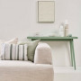 A scene that oozes tranquillity with different shades of green. Wall painted in Resene Double Rice Cake, front door in Resene Palm Green, console table in Resene Xanadu, table lamp in Resene Holly, ceramic tree in Resene Spanish Green, bowl in Resene Raineeand decorations and painted boxes in Resene Spanish Green, Resene Palm Green, Resene Rainee, Resene Xanadu, Resene Holly and Resene Double Rice Cake.