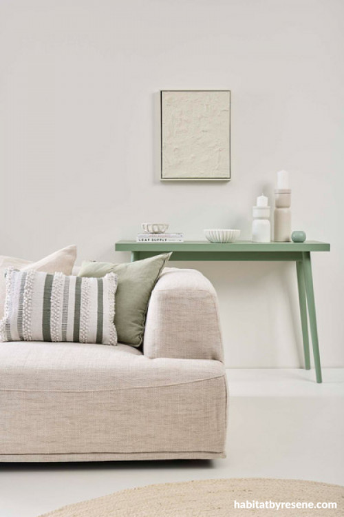 Green doesn’t just have to be for Christmas, it will look great all year round. Wall painted in Resene Double Rice Cake, console table painted in Resene Xanadu and DIY artwork in Resene Double Thorndon Cream. Cushion covers from H&M Home and Freedom, rug from Mocka, couch from Sabine Modular Right and Left hand 1 seater pieces from Nood.