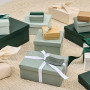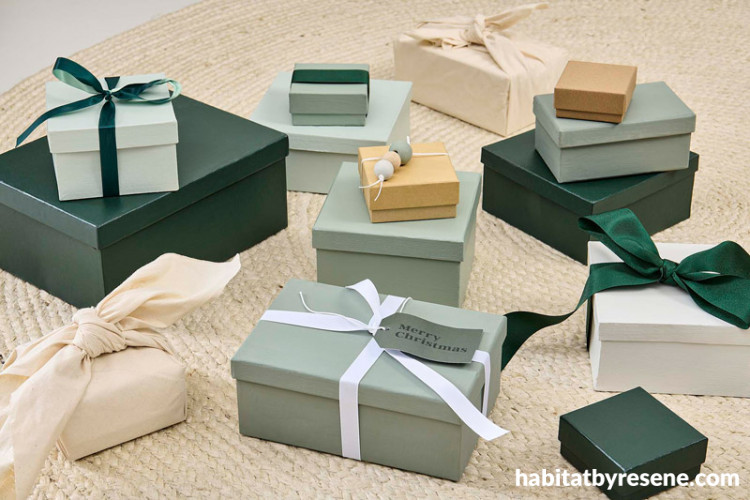 Gift sustainably with reused boxes painted in Resene Spanish Green, Resene Xanadu, Resene Double Rice Cake, Resene Rainee, Resene Palm Green and Resene Holly. Rug from Mocka.