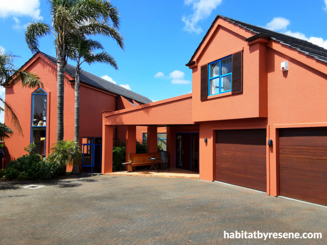 Helen says their bright blue aluminium joinery (for a Resene alternative, try Resene Anchor) was a bit of a shock when it arrived on the back of the truck when the house was being built, but the warmth of their Resene custom terracotta tone set the colour off perfectly.
