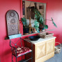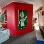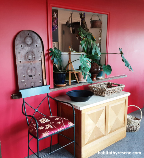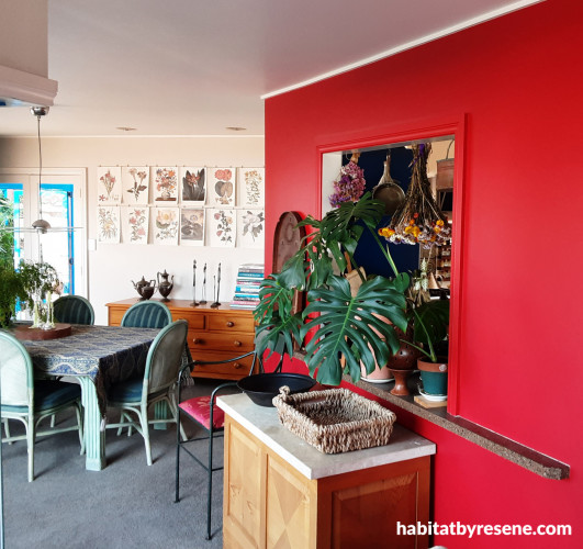 Colours inside the home needed to match the exterior’s warmth, and complement their story-filled treasures and furnishings. Resene Jalapeno is full of character and packs a punch on the lounge and hallway walls. The salsa red was a no-brainer, Helen says. “The walls have unusual curves and angles, so it was an easy decision to go bold. Our Four Square man looks amazing on the colour, he was rescued from the side of a local Whitianga glazing company truck, we gave them $10 and a box of beer.”