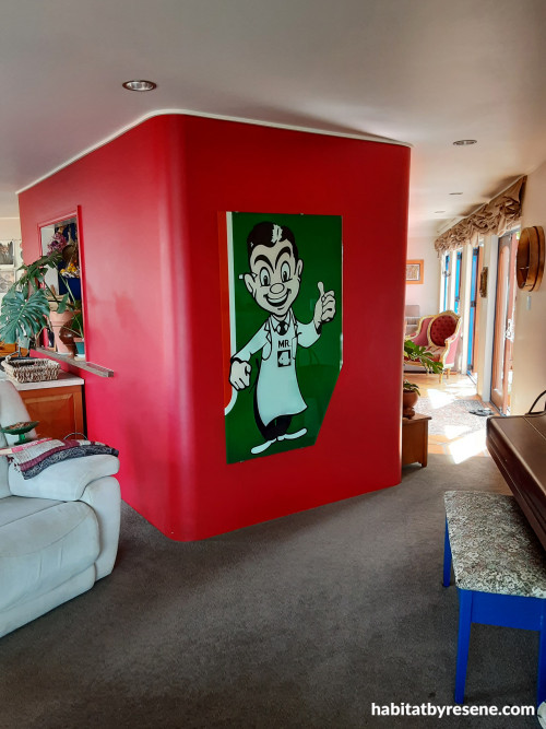 “Our Four Square man looks amazing on Resene Jalapeno, he was rescued from the side of a local Whitianga glazing company truck for $10 and a gifted box of beer.” The ceiling and other walls are Resene Blanc.