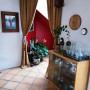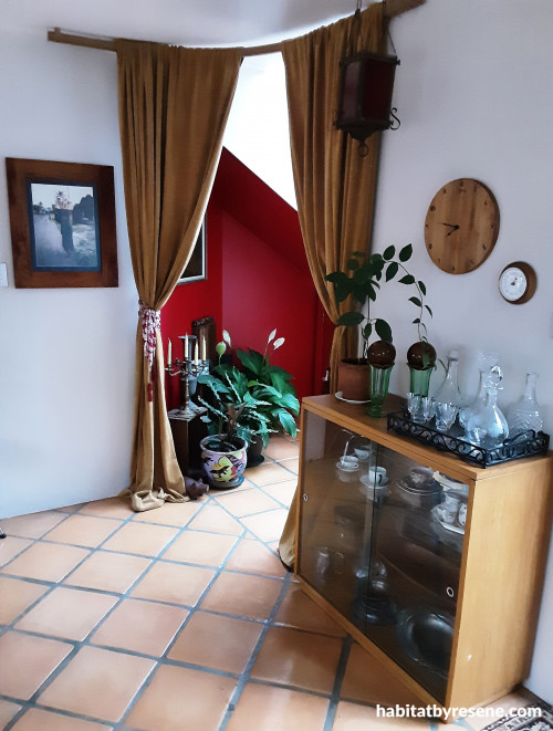 Recently a friend and interior designer (Sharon Fergusson) recommended the couple hang a ‘winter warmth curtain’ to separate the family room from the glass area towards their front door. The hanging gold fabric offers a warm and regal glow against Resene Jalapeno.
