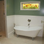 Throughout the new house, Alex and Nichole introduced character details like the replica clawfoot bath, stained glass windows and tongue and groove panelling. The walls are Resene Xanadu (green) with Resene Quarter Spanish White below, both using Resene Lustacryl paint.