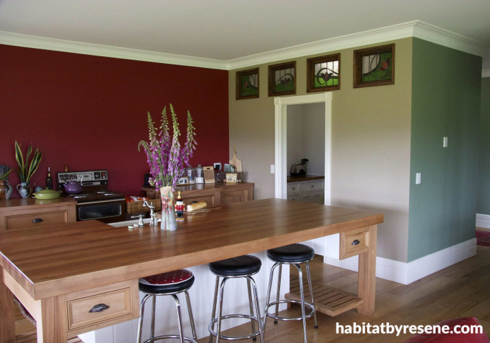 Not content with one strong green, the couple used Resene Xanadu in the entranceway and hall at the back, then the deeper Resene Tom Thumb for the hall in the foreground living room. The floors are recycled rimu from the old Feltex factory in Christchurch.
