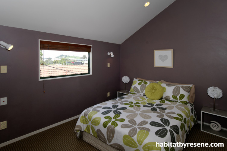 What colours did you use? Resene Double Blanc throughout the house, Resene Clockwork Orange in the study, Resene Mariner in the guest bedroom, Resene Echidna in the master bedroom and Resene Glacier in the en suite bathroom. In the living room there is a feature wall of Resene Calypso.