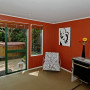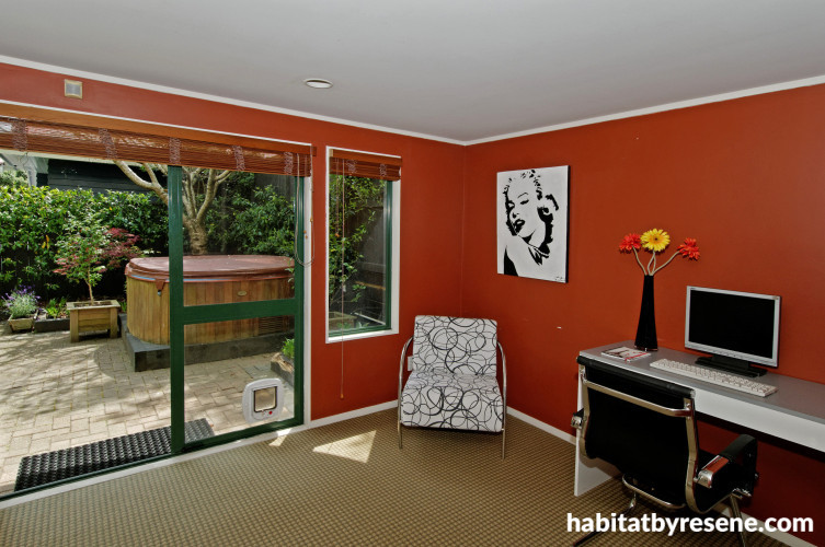 The study, which opens on to a sunny courtyard and spa pool, has been painted in Resene Clockwork Orange.