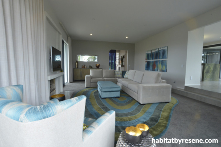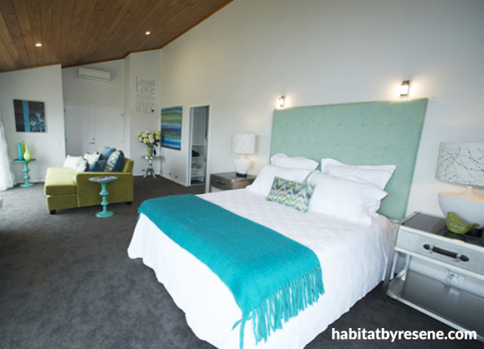Walls in Resene Double White Pointer are a sophisticated neutral backdrop for furnishings in shades of blue and green, colours which echo the views of sea and bush outside.