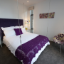 An inventive treatment for this bed saw it being suspended from the ceiling by cables. Shots of rich purple are offset by Resene Black White walls. In this video, Amanda explains the design and colour choices.