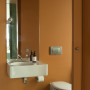 Another ‘happy colour’, Resene Hero, transforms the bathroom with its cheerful orange tones.