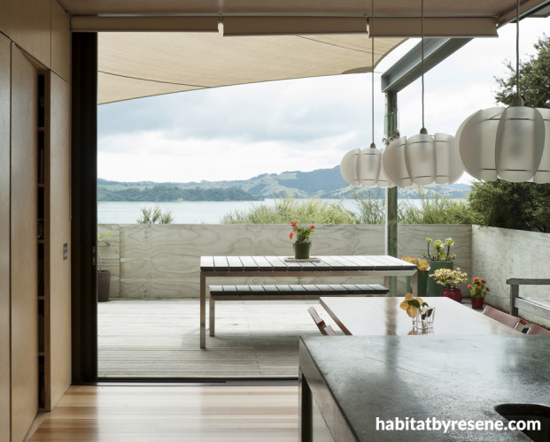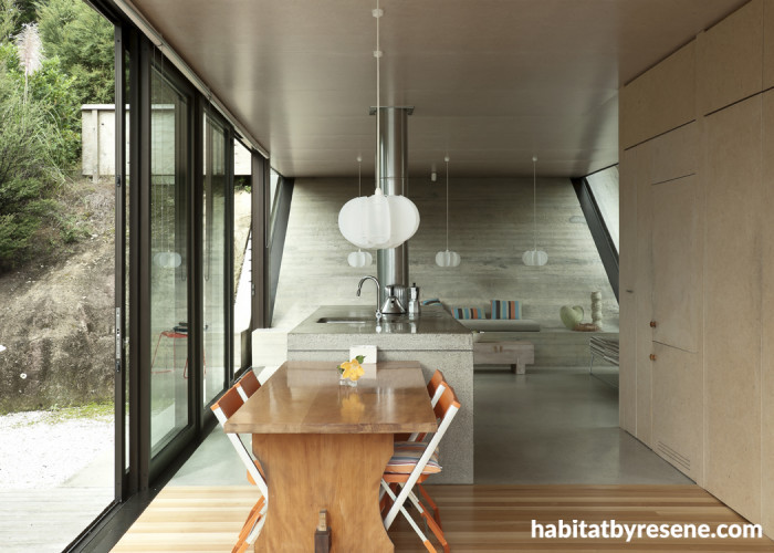 The concrete wave ripples further into the setting to become not only a sunken Japanese-style tub in the bathroom but a capacious kitchen bench. A woodburner tucked in under the bench is a conceptual reference to the ahi (fire pit). It gives the family another point of contact with community, too: pine cones collected locally and neighbourly donations of firewood are enough to keep the home fires burning.