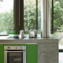 Another view of the kitchen, with its wide band of concrete wrapping around Resene Japanese Laurel cabinets.