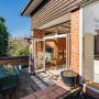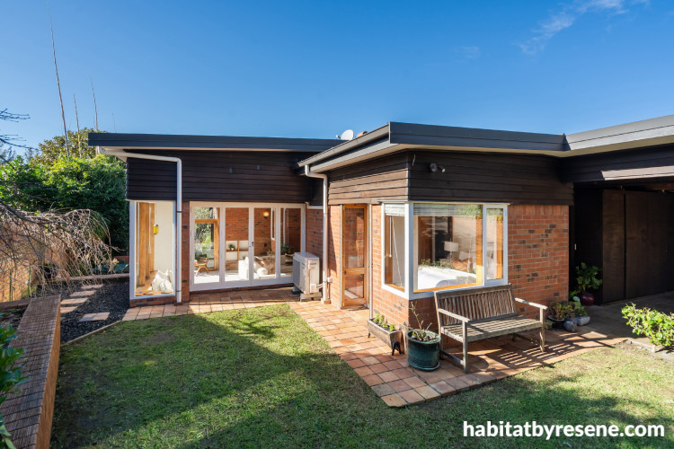 The family has enjoyed plenty of time soaking up the sun across multiple courtyards. Weatherboards are stained in Resene Woodsman tinted to Resene Treehouse teamed withexterior soffits, downpipes and windows painted in Resene Sonyx 101 tinted to Resene Alabaster. Resene Sonyx 101 tinted to Resene Ironsand is painted onto the fascia at the roof line.