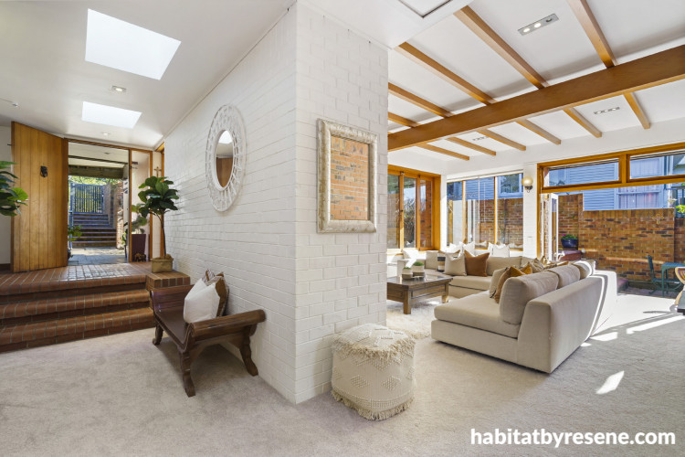 The home has plenty of space for both relaxing after busy workdays and hosting gatherings on weekends. Ian is a business advisor, leadership coach and the owner of Glass Half Full. Georgia is a real estate agent and owner of Back to Basics, a designer and manufacturer of fabric and copper eco-friendly products. Walls, trims and ceilings, including the brickwork, all finished in Resene Rice Cake.