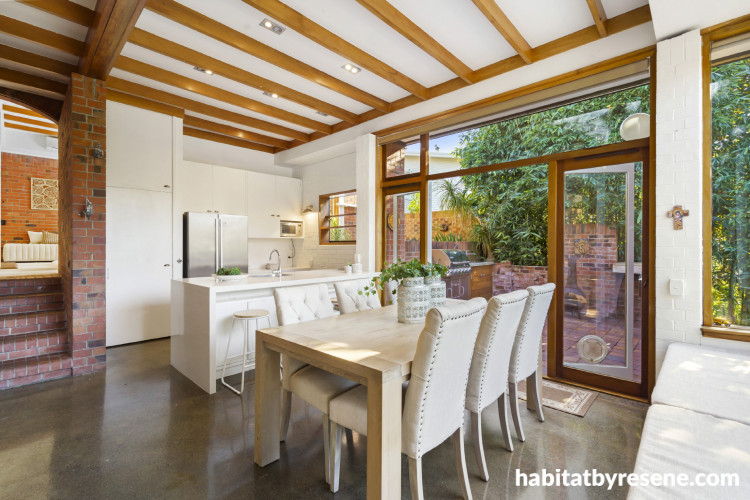 The kitchen is bright, light and open. “The house is positioned to get sun all day along the long side, this heats up the bricks and concrete. It remains warm, even in winter.” The walls, trims and ceiling are painted in Resene Rice Cake.