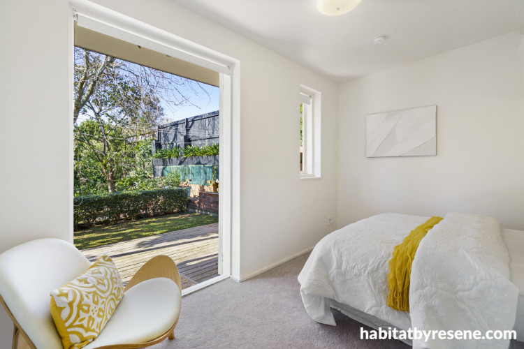 Resene Rice Cake offers a neutral backdrop for pops of colour, like these fashion yellow features in one of the home’s five bedrooms.