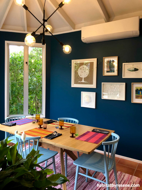 Inside, however, Vaughan was keen to use colour more liberally. “I was so excited to have a house with a separate dining room, I wanted to go bold with plenty of personality for entertaining. The house has had some odd additions, so it could handle going bold in the interiors.” After much deliberation, they went for Resene St Kilda for the dining room walls with the trims and ceiling in Resene Alabaster. Vaughan says the deep mineral blue made the perfect backdrop for what has evolved into an impressive gallery wall and that the room quickly became his favourite. “It has fantastic attitude. I love cooking for friends and family, so it is probably the room that has seen the most fun and laughter.”